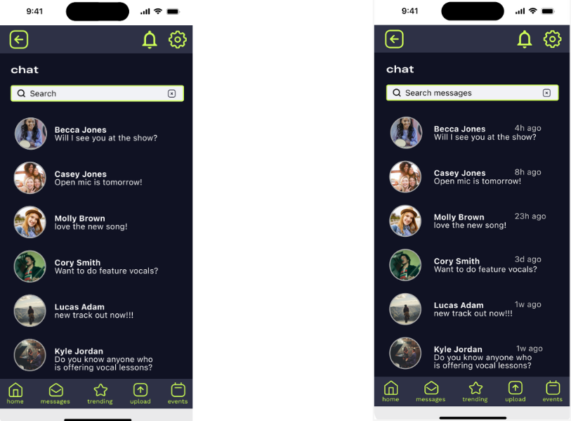 After my first round of tests using my sketches, I decided to incorporate a more involved flow for my red routes. While sketching, my red routes, or critical flows, were the registration process as well as uploading a song. Since one of the app’s major intentions is building and fostering connections, I decided to build out a flow for messaging other users on the app, and introduce that to users the next time I tested. I am happy to have done this, as concentrating on relevant flows during the testing process gave me invaluable feedback from the participants.
