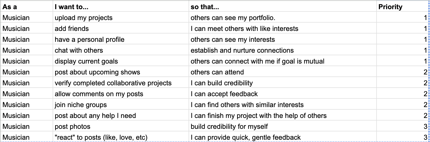 Creating a user story enabled me to take the information from my user’s persona and prioritize the tasks from most to lease important.